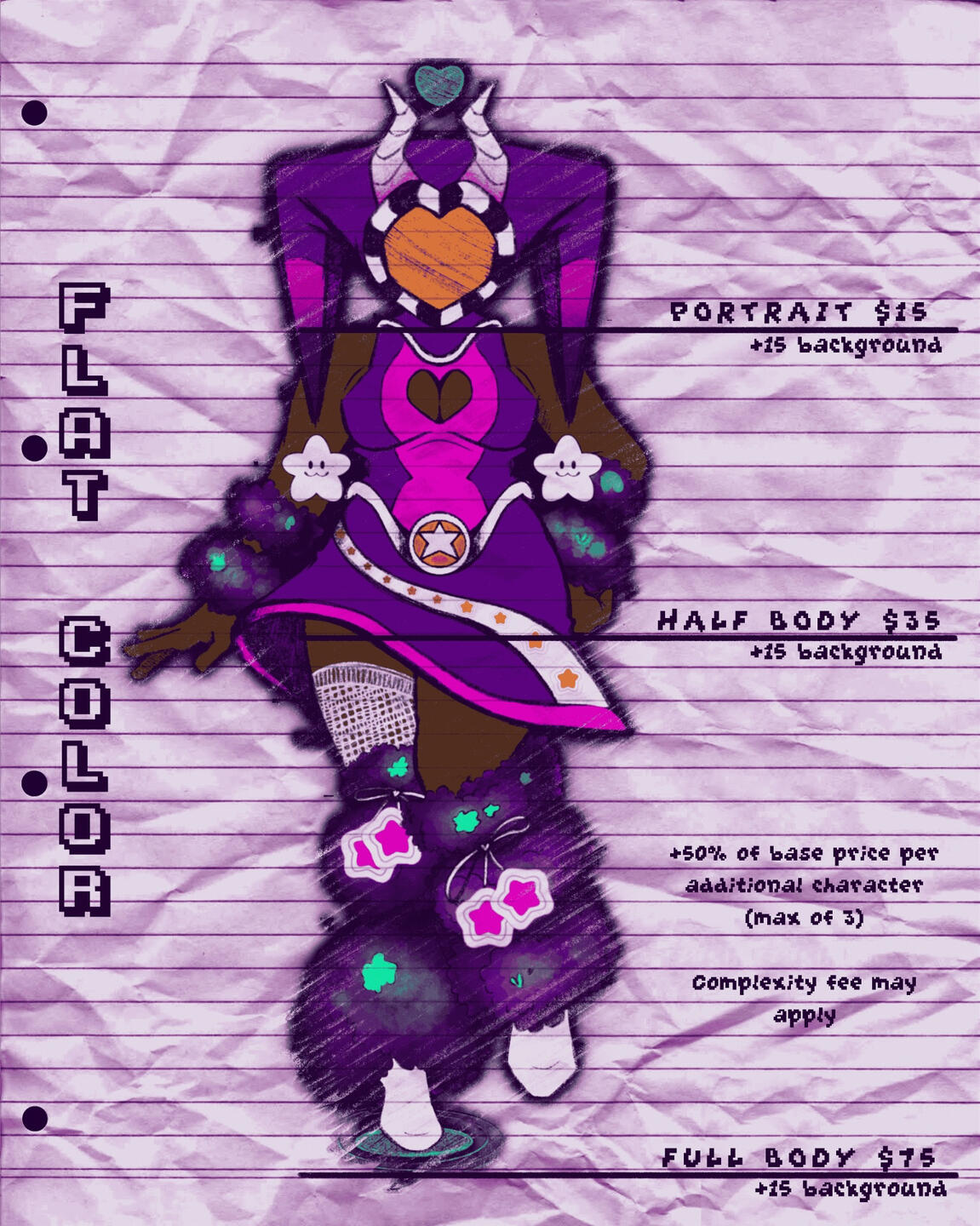 Extra fees for rush, extra characters, complex scenes, commercial use, closer likeness, or revisions.